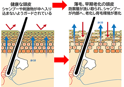 頭皮の早期老化の原因、残留しているヘア商品の除去と補修&保護、頭皮の菲薄化を抑制